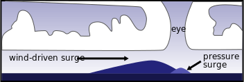 This depicts a graphic illustration of wind-driven surge, which is the rise in water level caused by strong winds. This phenomenon can occur during storms and hurricanes when air pressure drops, causing the ocean to rise. The graphic shows the relationship between wind speed, wind direction, and the resulting surge height. The illustration also includes a diagram of an eye, which is a key feature in many weather systems, including tropical cyclones or hurricanes. This eye is surrounded by swirling clouds that represent the storm's rotation. The image provides valuable information about wind-driven surges and their impact on coastal areas during severe weather events.