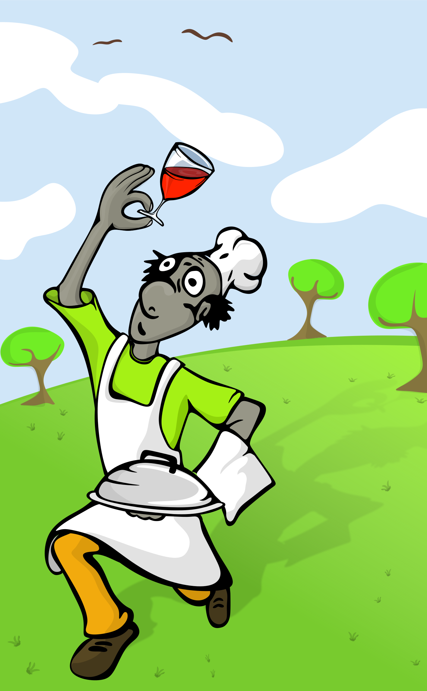 This features a cartoon chef in an apron, holding a glass of wine and a plate. He appears to be enjoying his time outdoors as he poses for the picture. In the background, there are trees that add to the natural setting. The scene is colorful and whimsical, with the chef's exaggerated pose and the playful elements in the image.