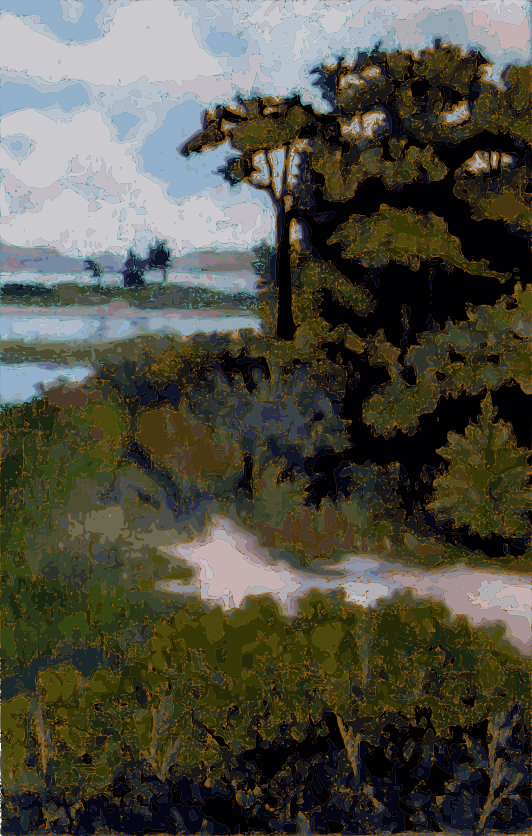 This features a serene landscape with trees and shrubs lining the shore of a bay. There are several trees in the foreground, some closer to the water's edge while others stand further back. A few people can be seen scattered throughout the scene, possibly enjoying the view or engaging in outdoor activities. The overall atmosphere is peaceful and inviting, with the natural elements of the landscape creating a sense of tranquility.