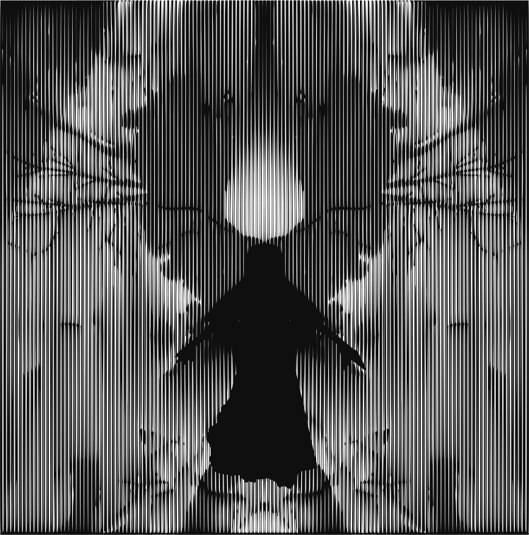 This is a black and white photograph of an angelic figure, possibly a woman. The photo has been manipulated to create a blurred effect around the edges, giving it a supernatural appearance. The background appears to be a mix of light and dark tones, adding depth to the scene. The overall composition of the image is visually striking and intriguing, with the angelic figure being the focal point of the photograph.