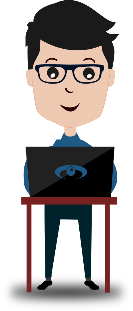 This features a cartoon man wearing glasses and sitting at a desk with an open laptop. He appears to be working or browsing the internet, possibly as a hacker. The man is dressed in a blue shirt and has a smiling expression on his face. The scene takes place in front of a wooden table that serves as the backdrop for this cartoon character.