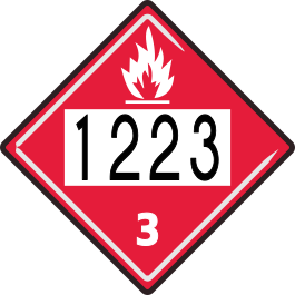 This features a red and white sign with the number 1234 on it. This sign is likely used to indicate hazardous materials, specifically kerosene, as it warns of potential fire risks associated with the contents of the vehicle. The sign's bold colors make it easily noticeable for drivers and pedestrians alike, ensuring that they are aware of the potential dangers in the area.