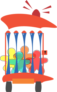 This features a cartoon representation of spirit prison, with an orange and red vehicle carrying several colorful objects. These objects are arranged in various positions on the vehicle, creating a visually appealing scene. There is also a clock present within this unique design, adding to its intriguing appearance. Overall, it's a creative and imaginative representation of spirit prison that captures attention with its vibrant colors and interesting arrangement of objects.