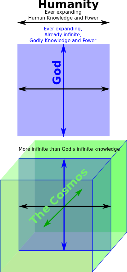 This is a diagram that illustrates the concept of humanity, knowledge and power. It shows how ever expanding God's knowledge and power can be compared to an infinite number line. This line represents the vastness of God's knowledge and power, which is greater than any other entity or concept. The diagram also includes a box labeled "God" that contains the word "Infinite." This further emphasizes the idea that God has unlimited knowledge and power compared to all other entities in existence.