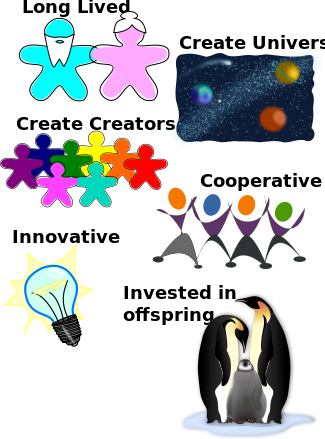 This showcases a variety of different concepts and ideas, including the creation of universes, cooperative efforts, innovation, investment in offspring, and the idea of long-lived beings. These concepts are represented by various images such as a penguin, a light bulb, people dancing, and other creative elements. The image is visually appealing and thought-provoking, inviting viewers to contemplate these different ideas and their potential implications in the world around us.
