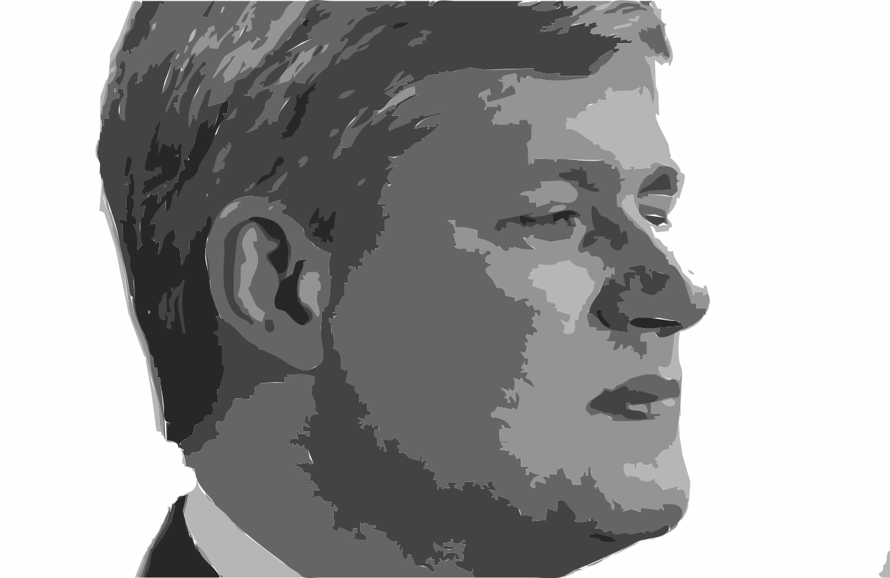 This is a black and white drawing of a man with short hair, wearing a suit. He has a serious expression on his face as he stares into the distance. His lips are slightly parted, giving him an intense look. The drawing captures the essence of the man's features, including his eyes, nose, and mouth. The overall effect is that of a classic portrait, with the subject appearing thoughtful and focused on something beyond the frame.