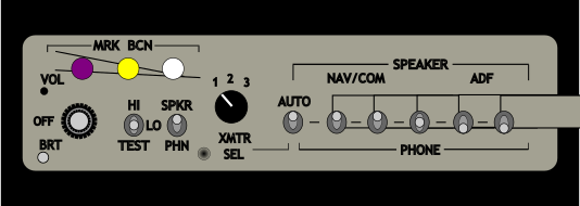 This features a control panel with various knobs and buttons, likely used for controlling audio equipment in an aircraft. There are several knobs on the left side of the panel, as well as two buttons located towards the top right corner. Above these controls is a row of text that reads "NAV/COM/ADF," indicating different functions related to navigation and communication systems. The control panel also has a section for adjusting the brightness and audio levels for marker beacons. Overall, this image showcases an essential component of aviation technology designed to manage audio equipment during flights.