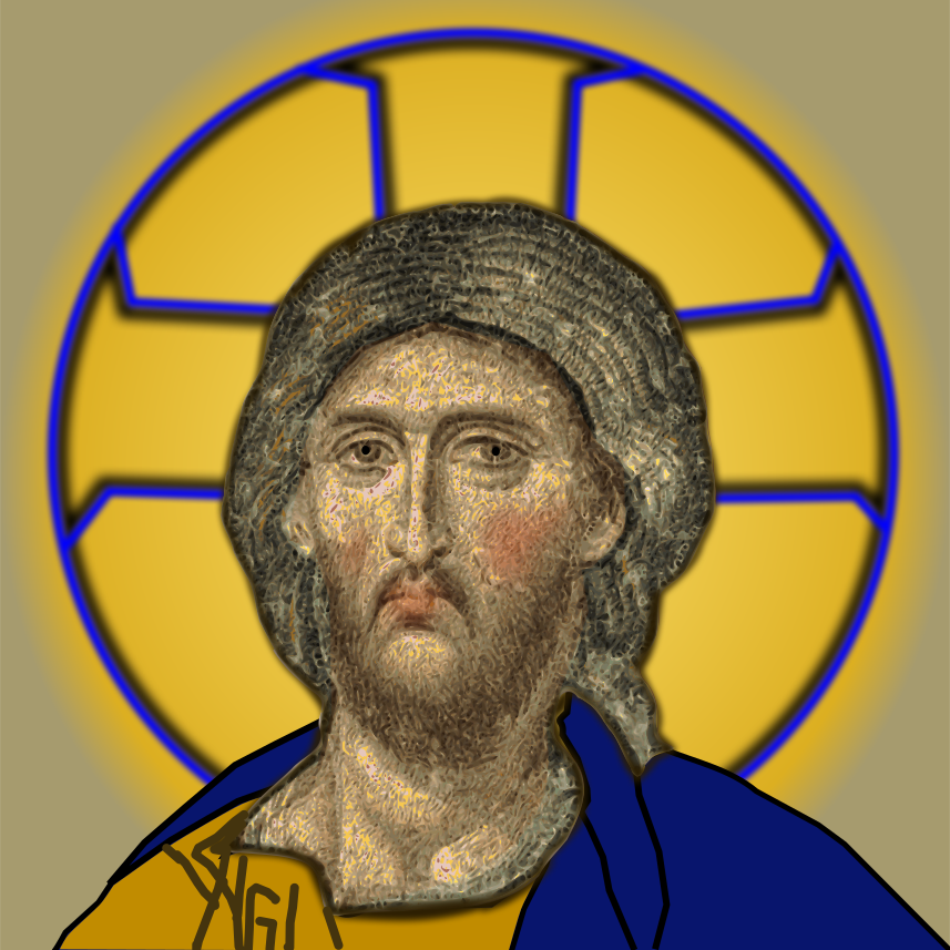 This features a mosaic illustration of Jesus Christ, depicting him as the central figure in a religious context. He is wearing a yellow robe and has a halo above his head, signifying his divine nature. The artwork showcases intricate details, including a crown on top of his head, which adds to the overall grandeur of the scene. The image also includes a cross in the background, further emphasizing the religious theme. Additionally, there is an interesting detail of a basketball in the upper left corner of the picture, possibly indicating that this artwork was created with a modern twist or to appeal to a broader audience. Overall, the mosaic illustration captures the essence of Jesus Christ and his significance within religious history.