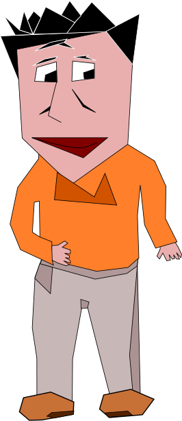 This features a cartoon drawing of a man wearing an orange shirt and khaki pants. He is standing with his hands on his hips, giving the impression that he's posing for a picture. His facial expression appears to be somewhat serious or concerned, as if he's deep in thought. The cartoon character has a distinctive look, making it stand out from other typical drawings of people.