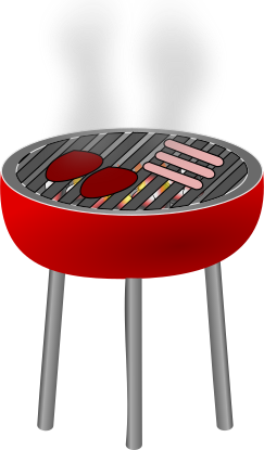 This features a red grill with three legs, placed on top of a table. On the grill, there are three hot dogs and two hamburger patties being cooked. The scene is set in a kitchen environment, with smoke rising from the food items as they cook. This illustration captures the essence of outdoor barbecue cooking, where people gather to enjoy delicious meals together.