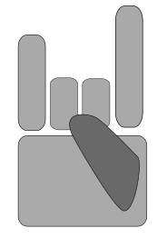 This features a hand holding up a rock, which is shaped like an upside-down guitar. This unique design gives the impression of a heavy metal sign. The hand itself has a gray outline and appears to be pointing towards the rock, emphasizing its shape as a guitar. The overall composition creates a visually striking representation of a heavy metal theme.