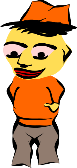 This features a cartoon-like character, possibly a doll or a drawing of a man with an orange shirt and hat. This character has a yellow face and is wearing glasses. It appears to be standing in front of a wall, giving the impression that it's posing for a picture. The overall appearance of this character suggests a playful and fun atmosphere.