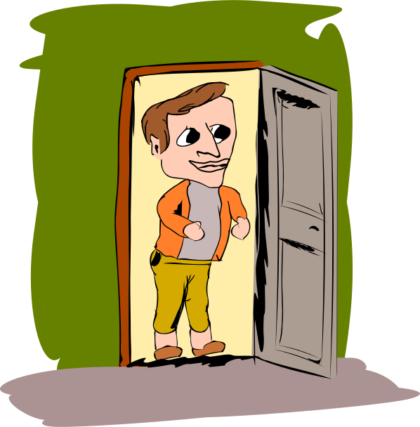 This features a man in a cartoon-like drawing, wearing an orange jacket and brown pants. He is standing next to a doorway with his hand on the door handle, giving off a playful vibe. The man appears to be smiling as he walks into the room or closes the door behind him. The scene has a whimsical feel to it, making it an interesting and unique piece of artwork.