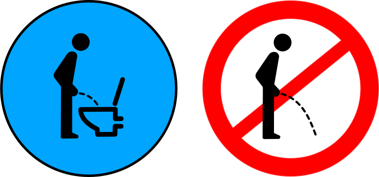 This features two signs, one blue and the other red. The blue sign is a cartoon of a man urinating into a toilet bowl, while the red sign has an illustration of a man peeing on the floor. These signs are placed next to each other, likely in a public restroom or similar setting where people might engage in such behavior. The blue sign is positioned slightly above the red one, creating a contrast between the two images.