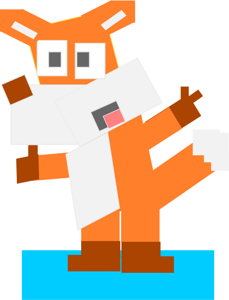 This features a cartoon-like fox with an orange body and white belly, tail, and face. It is holding a square box in its arms while standing on one leg. The fox appears to be made up of various square and rectangle shapes, giving it a unique and playful appearance.