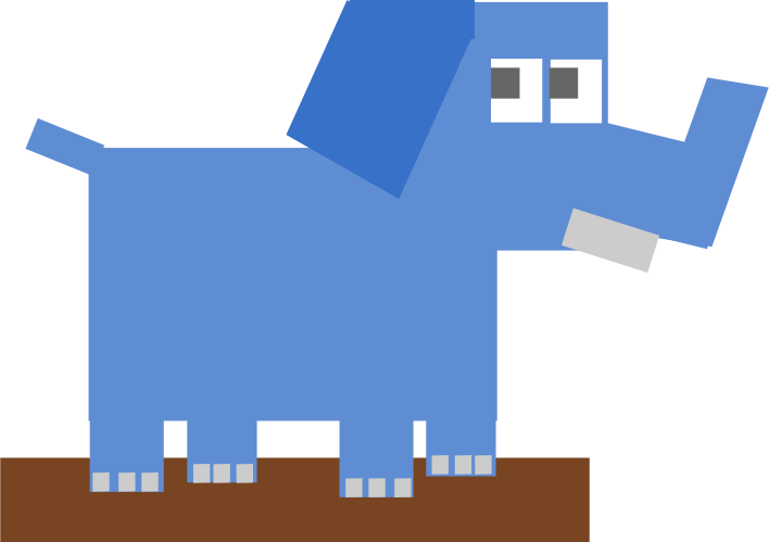 This features a blue elephant made from squares, standing on a brown landing. It is an interesting and unique design that gives the impression of a 3D object. The elephant has its trunk raised, giving it a playful and curious appearance. Its large size and distinctive color make it stand out in the scene. Overall, this image showcases creativity and artistic expression through the use of squares to create an eye-catching and memorable representation of an elephant.