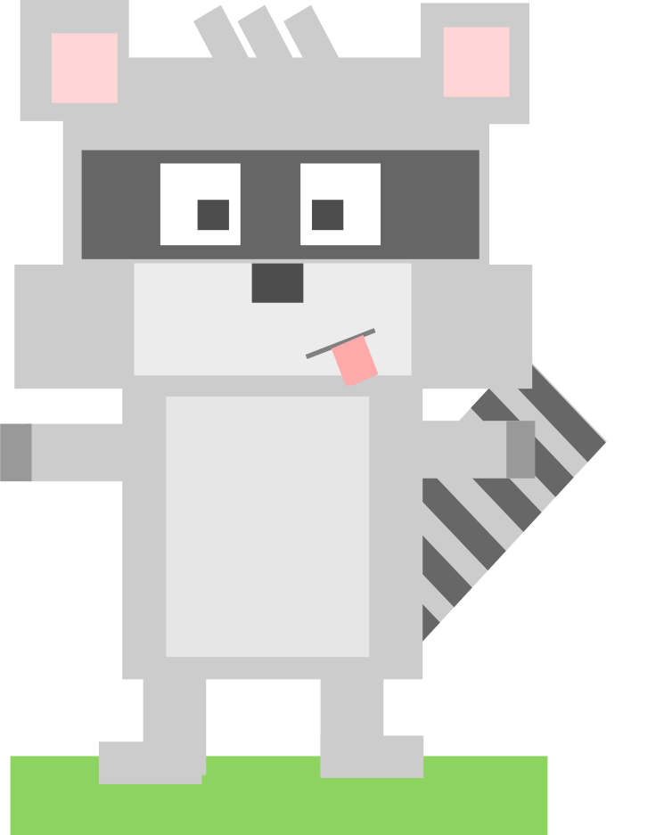 This features a cartoon-like raccoon with big eyes and a mouth, standing on a green field. It is an animated character that appears to be made from simple shapes like squares and rectangles. The raccoon's facial expression seems to convey a sense of humor or playfulness as it poses for the camera. This image could potentially be used in various contexts such as advertising, entertainment, or educational materials where an animated character is needed to engage viewers or teach specific concepts.