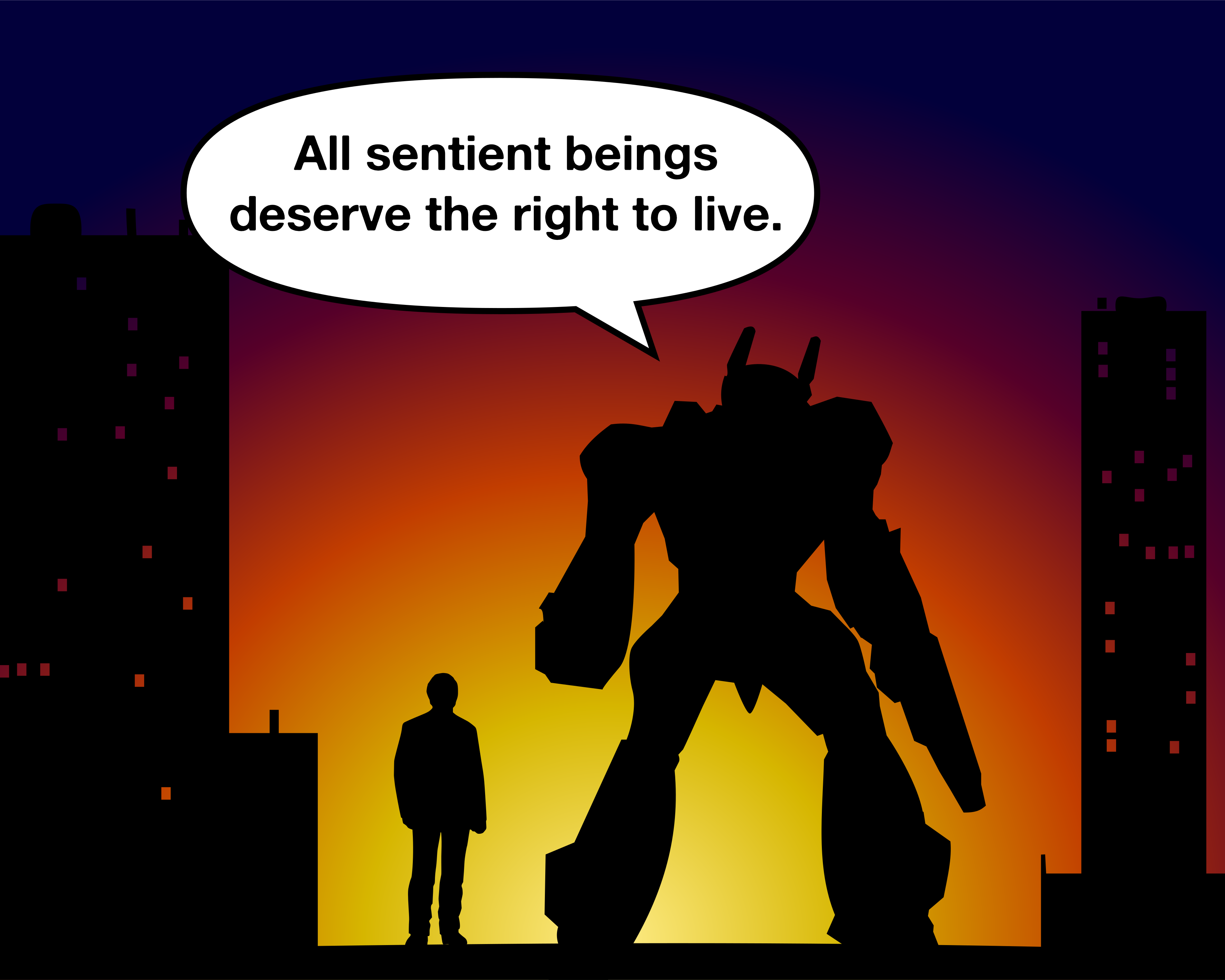 This features a man standing in front of a large robot, which is positioned towards the right side of the scene. The man appears to be looking at the robot, possibly engaging in conversation or observing it. The robot has a speech bubble above its head, displaying the message "All sentient beings deserve the right to live." This image could represent an artistic expression or commentary on the importance of respecting and valuing all living beings.