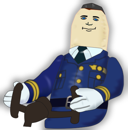 This features a cartoon character, Otto the autopilot, dressed in a dark blue pilot outfit. He is sitting down and appears to be wearing a tie as part of his uniform. The illustration captures the essence of this unique character, showcasing him in a relaxed position while still maintaining his professional appearance. This creative representation of Otto the autopilot adds an element of fun and whimsy to the scene.