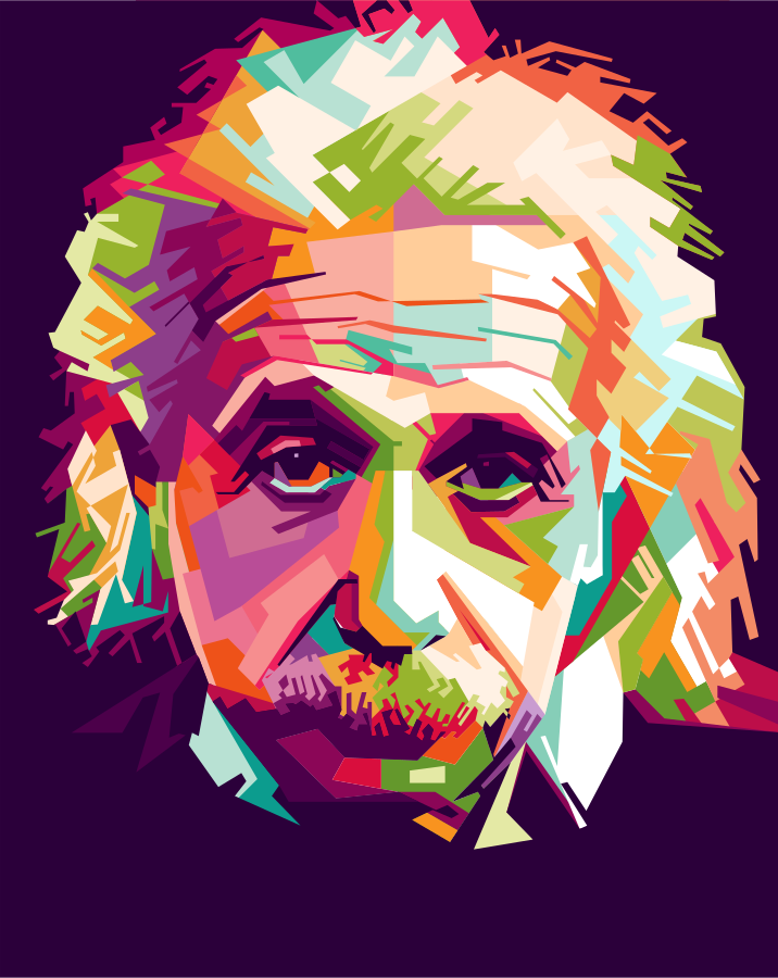 This is a colorful portrait of Albert Einstein, the famous physicist. It features a close-up of his face with a mix of colors and patterns that create an artistic effect. The portrait is presented in a digital format, likely created using a software like Inkscpe or WPAP (Wedha's Pop Art Portrait). This style of artwork adds a unique visual appeal to the image, making it stand out as a piece of creative expression.