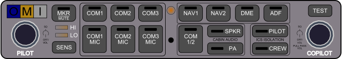 This features a control panel with various buttons and knobs, likely used for controlling audio equipment in an aircraft. There are multiple buttons arranged across the top of the panel, each possibly corresponding to different functions or settings. A knob is also present on the left side of the panel, which could be used for adjusting volume or other audio-related parameters. The control panel appears to be a crucial component of the avionics system in an aircraft, allowing pilots to manage and monitor various audio components during their flights.