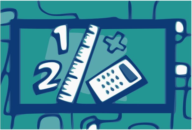 This features a blue and white drawing of a ruler, calculator, and cell phone. The ruler is positioned on the left side of the image with its numbers labeled in black. On the right side of the image, there is a calculator with a keyboard and buttons visible. A cell phone can be seen placed above the calculator, completing the trio of objects. This drawing appears to be part of an educational or informational material, possibly aimed at teaching children about basic math concepts and technology usage.