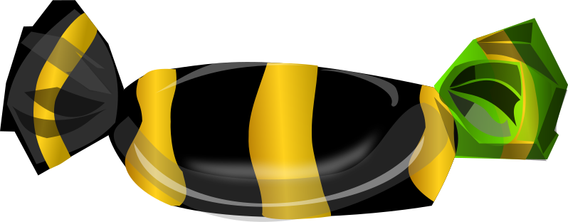 This features a candy that is wrapped in black and yellow stripes. It appears to be a piece of candy with a wrapper, giving it an appealing appearance. The candy is placed on a table, which serves as the background for this delightful treat. This type of candy could be enjoyed by people of all ages, making it a popular choice for snacking or sharing with friends and family.