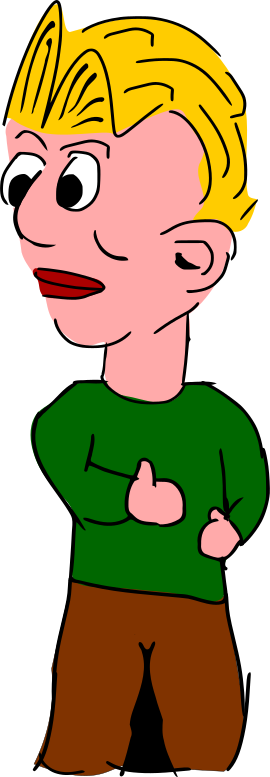 This features a cartoon drawing of a man wearing a green shirt and brown pants. He has his hand on his hip, giving off an attitude or a sense of confidence. His facial expression appears to be somewhat displeased or unhappy. The drawing is in color, adding vibrancy to the scene.