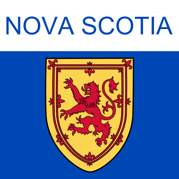 This features a flag for Nova Scotia, which is a province in Canada. The flag has a blue background with a yellow shield in the center of it. On top of the shield, there is a red lion, adding to the vibrant colors of the flag. This emblem represents the pride and heritage of the people from Nova Scotia.