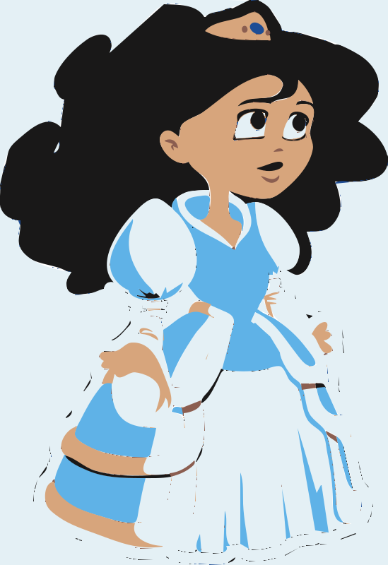 This features a young girl dressed in a blue and white dress, with her hair styled in braids. She appears to be wearing a tiara on her head, adding an elegant touch to the outfit. Her expression is somewhat concerned or worried, as if she's facing a challenge or problem. The overall scene gives off a sense of innocence and vulnerability, with the girl seemingly in need of assistance or guidance.