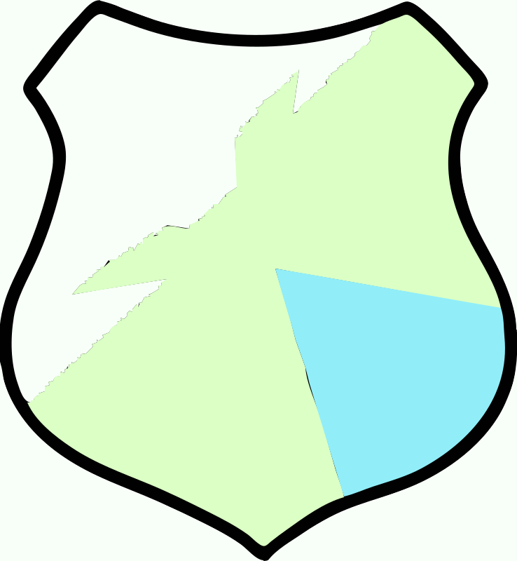 This features a shield with a blue and green color scheme. In the center of the shield, there is an area that appears to be missing or damaged, possibly indicating wear or tear. The shield has a map-like design on it, which adds visual interest to the overall appearance. The colors used in this shield are predominantly blue and green, creating a striking contrast against the white background of the image.