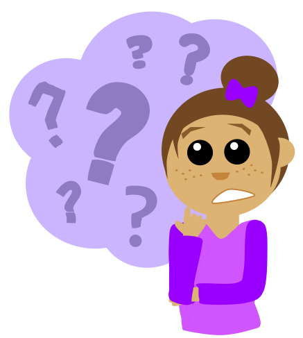 This features a cartoon girl with a purple shirt and a bow in her hair. She is standing next to a thought bubble filled with question marks, which are scattered throughout the scene. The girl appears to be posing for the camera while she stands near the bubble of questions. This illustration creates an interesting visual effect that combines elements of both real-life and cartoonish styles.