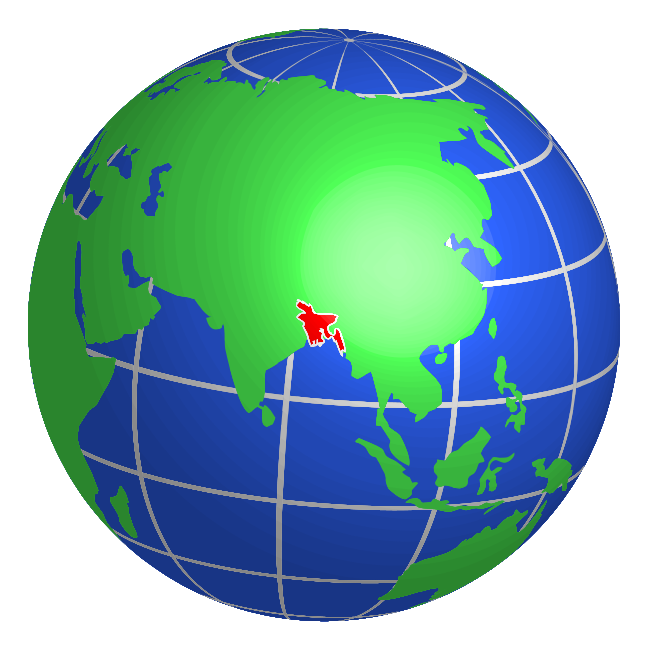 This features a blue and green globe with the continents of Asia, Africa, and Europe visible. In the center of the globe, there is a red dot representing Bangladesh. This unique perspective showcases the country's location in relation to other countries on the planet. The globe provides an interesting visual representation of our world, highlighting the interconnectedness of different regions and nations.