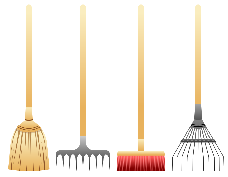 This features four different types of cleaning tools, each with a unique design. The first tool is a broom, which has a long handle and bristles to sweep away dirt and debris. Next to the broom is a metal rake, designed for gathering leaves or other materials from the ground. A shovel can be seen in the middle of the tools, with its curved blade used for digging and scooping up items. Lastly, there is a leaf rake, which has a similar design to the broom but is specifically designed for collecting leaves during fall cleanup. These four tools are arranged side by side, showcasing their various uses in maintaining a clean and organized home environment.