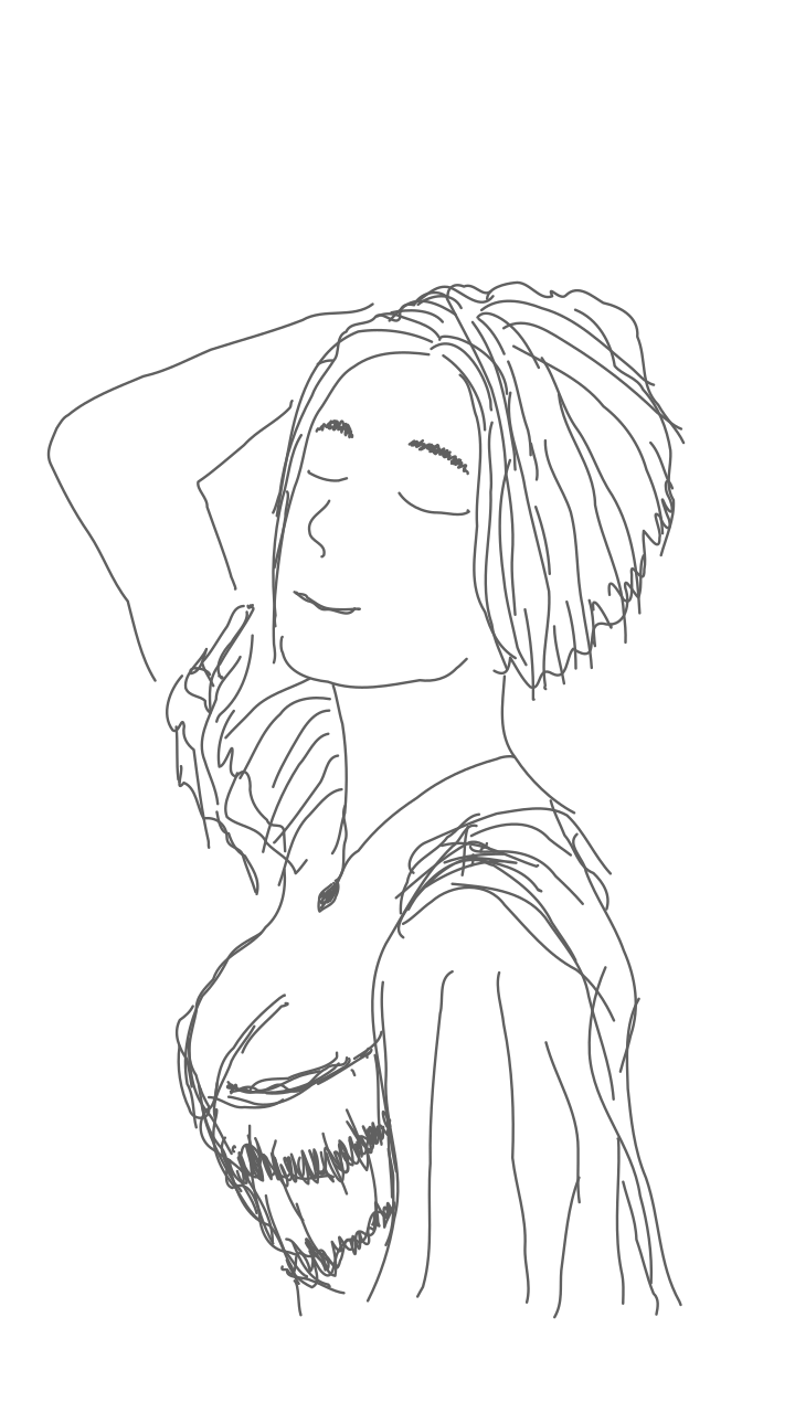 This is a black and white drawing of a woman with long hair. She has her hand on her head, possibly resting it or adjusting her hair. Her eyes are closed as she poses for the picture. The drawing captures her facial expression and features, giving an artistic representation of the subject.