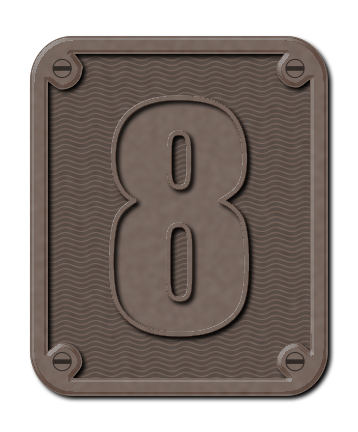 This features a brown metal plate with the number 8 prominently displayed on it. The plate is made of metal and has a unique texture, making it stand out as an interesting piece of art or decoration. The number eight is clearly visible in the center of the plate, drawing attention to its significance. This could be used for various purposes such as identification, artistic expression, or even as a functional item like a license plate.