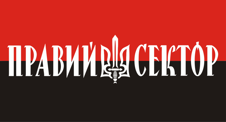 This features a flag with the words "Right Sector" written in white on it. The flag is rectangular and has red and black colors, giving it an eye-catching appearance. In the middle of the words, there is a sword symbol that adds to the flag's visual appeal. This flag seems to represent a group or organization with a strong presence in Ukraine.