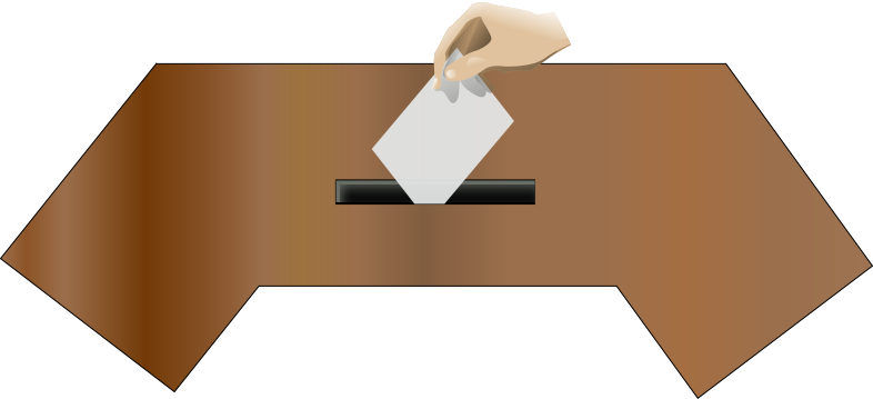 This features a wooden table with a brown colored ballot box on it. A hand is seen placing an envelope into the ballot box, which is white in color. This scene likely represents the process of casting a vote during an election or other voting event. The wooden table serves as a stable surface for this important activity, and the presence of the hand adds a sense of human involvement to the process.