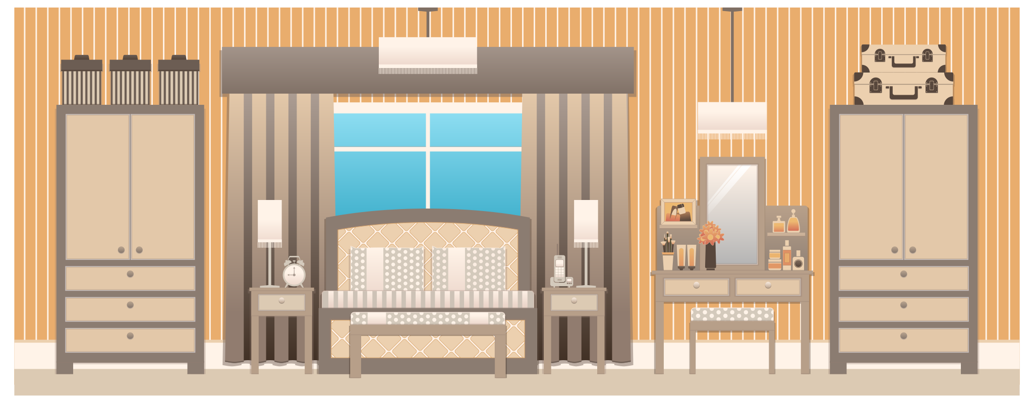 Tags: bed, bedroom, curtains, desk, drawers, dresser, furnishings, furniture, lamp, light, mirror, room, table, wallpaper, wardrobe, window, background bedroom