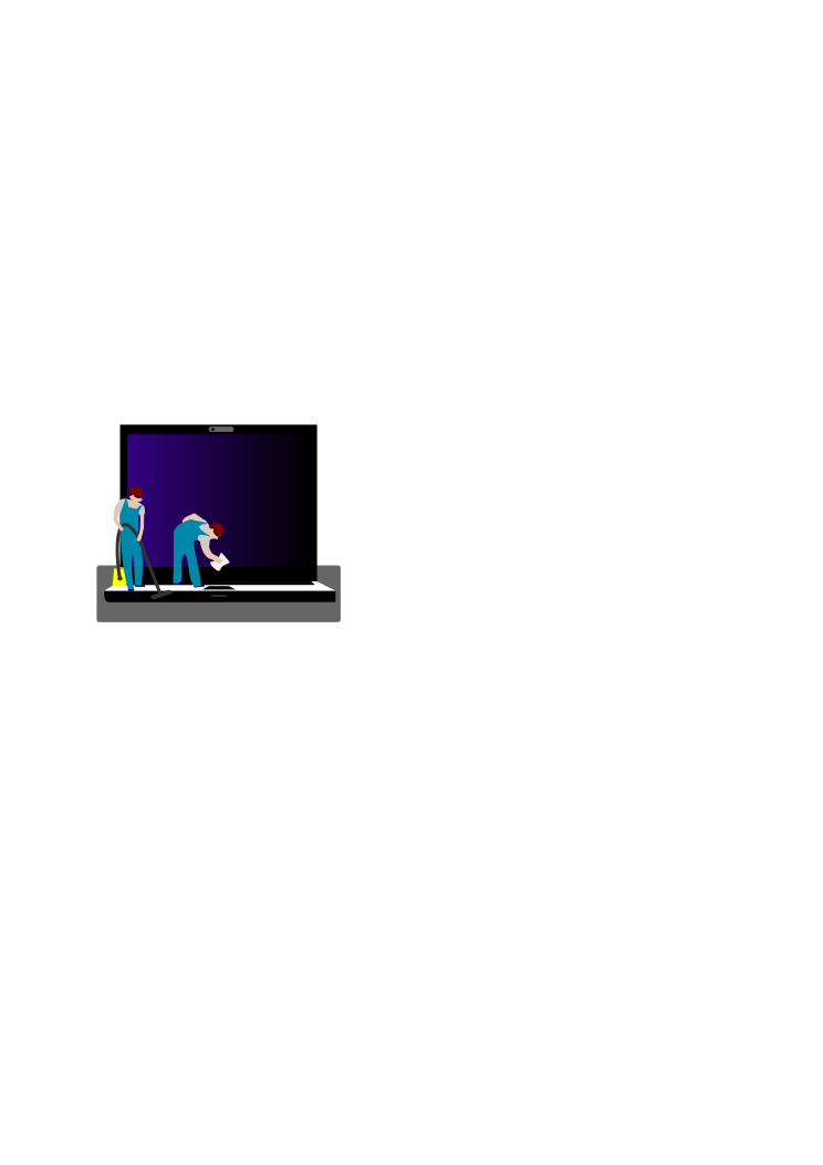This features a black laptop computer with two small people cleaning it. One person is located on the left side of the laptop, while the other is positioned towards the right. They appear to be focused on their task and are likely working together to maintain the device's cleanliness. The laptop itself occupies most of the image, taking up a significant portion of the frame.