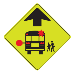 This features a yellow sign with an arrow pointing upwards, indicating that there is a school bus stop ahead. Above the sign, there is a picture of a school bus and two people walking away from it. This cautionary sign serves to alert drivers to be cautious when approaching the school bus stop, as children may be crossing the street or getting on/off the bus. The sign's bright yellow color ensures that it stands out against various backgrounds, making it easily noticeable for all road users.