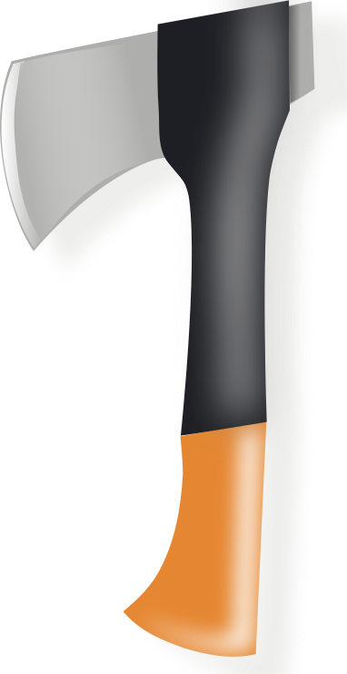This features a large, colorful axe with an orange handle. It is prominently displayed in the foreground of the picture, taking up most of the frame. The axe has a black and orange head, making it stand out against the background. In the background, there is a wall that provides a contrasting backdrop to the vibrant color of the axe. This image showcases an eye-catching piece of equipment that would likely be used for various tasks around the home or workplace.
