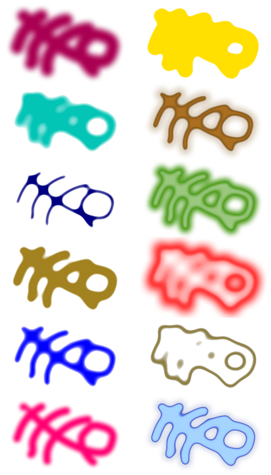 This displays a collection of various colored and shaped objects, including cars, fish, and other items. These objects are arranged in a row, with each item having different colors and shapes. They appear to be designed for use as drawing tools or artistic elements, adding an organic or liquid look to drawings when used. The image also suggests that these objects can be resized and modified by the user, allowing them to create unique designs and effects in their work.