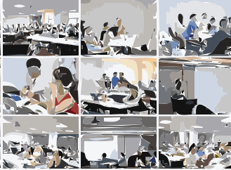 This is a collage of several photos featuring people in an office setting. In the first photo, two women are shaking hands while others watch them. There are multiple chairs and dining tables scattered throughout the room, with some people sitting at the tables. A TV can be seen mounted on one wall, and there are various cups placed around the room. The collage captures different moments of interaction between people in this office environment.
