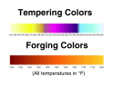 This displays a chart comparing two different types of colored metal. One type is described as "tempering colors," which are used to create a specific color on the surface of the metal, while the other type is referred to as "forging colors." These forging colors are used to change the color of the metal during the forging process. The chart shows various shades and hues of both types of colored metals, with each color represented by a different shade on the chart. This comparison highlights the differences between these two methods of altering the appearance of metal surfaces.