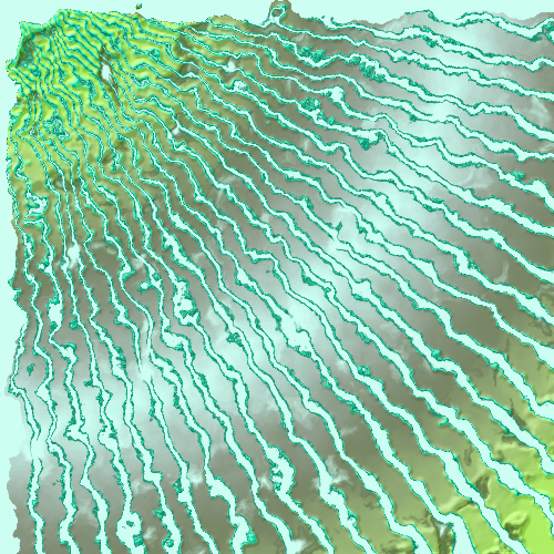 This features a large, green landscape with an intricate pattern of waves and lines. These patterns create a visually striking scene that resembles the surface of water or a wave-like structure. The colors in the image are predominantly shades of green, which adds to the overall atmosphere of the scene. The combination of these waves and lines creates a unique and captivating visual experience for viewers.