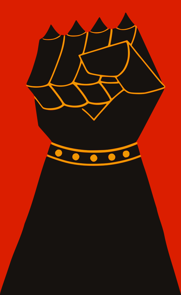 This features a black and orange fist with spikes on it, symbolizing strength and power. The fist is prominently displayed in the center of the image, taking up most of the frame. The combination of black and orange colors creates a striking contrast against the red background, making the fist stand out even more. This bold design could be used for various purposes such as an emblem or logo representing a cause or organization that values strength and resilience.