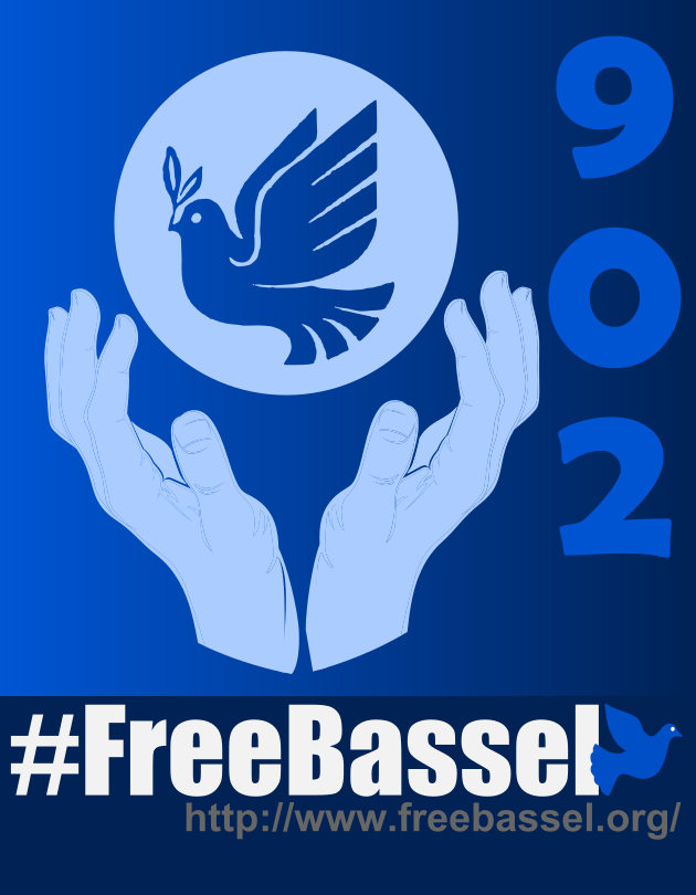 This features a blue poster with a bird inside of a light blue circle, which is being held by two hands. The hands are positioned on either side of the circle, creating an impression that they are holding it up. The bird is located in the center of the circle and appears to be flying away from the viewer's perspective. Below the image, there is a text "Free Bassel" which suggests that this poster might be related to a cause or campaign advocating for someone named Bassel. The combination of the blue bird, hands holding the circle, and the message "Free Bassel" creates an eye-catching visual that conveys a sense of freedom and support for the person in question.