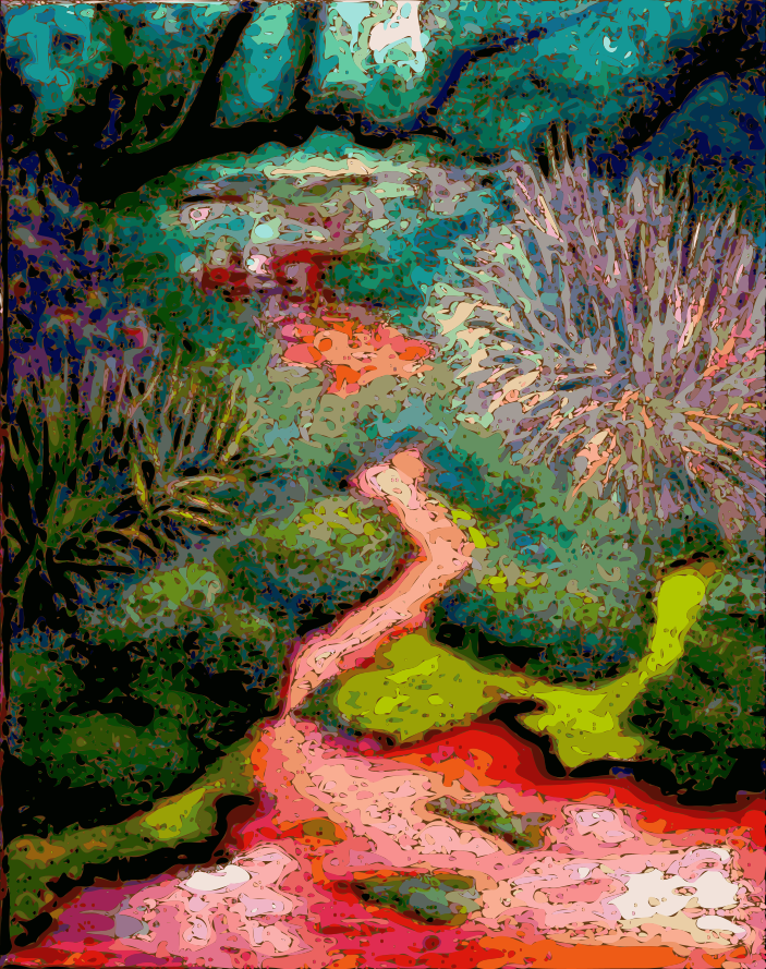 This depicts a vibrant and colorful scene of a pathway through the woods. Along the path, there is a shallow stream with pink water that adds to the lively atmosphere. The stream is surrounded by green moss and various plants, creating an enchanting environment. In addition to the stream, there are trees on both sides of the path, providing shade and a sense of depth to the scene. Overall, this artistic representation captures the beauty of nature and its tranquil surroundings.