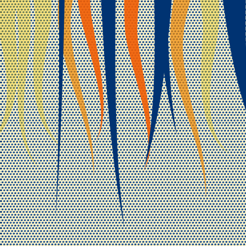 This features a background made up of polka dots, with large wavy shapes descending the image. These shapes are in shades of orange, yellow and blue, creating an interesting visual effect. The dots themselves are scattered throughout the scene, adding depth to the overall composition. The combination of these elements creates a unique and eye-catching design that stands out against its background.